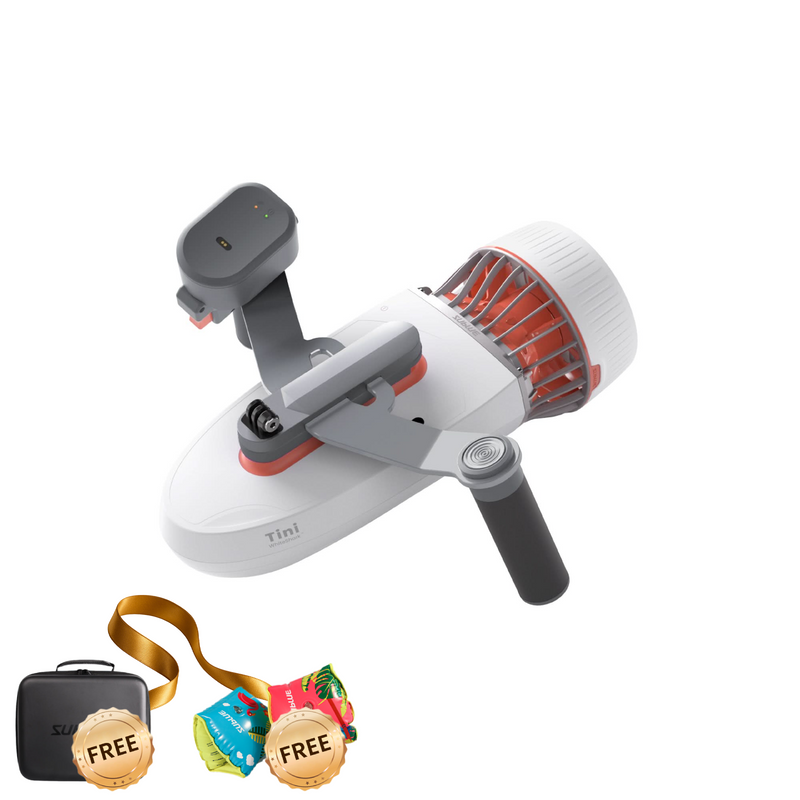Tini adopts Sublue self-developed high-efficiency motion system and wireless control technology, innovative modular design, realizes the flexible assembly of components, is convenient to carry, and meets the diversified needs of single-boosting.Double-boosting, multiple-boosting, and motion assistance. Optional floater, mobile phone waterproof case holder, double-boosting combination handle, inflatable floating board andother official accessories. There is a standard sports camera hanging point under the front of the product, and a mobile phone waterproof case holder is added through the floater accessory shell to easily record underwater moments.