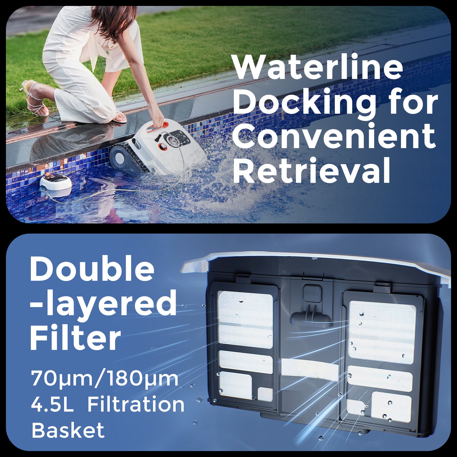 · Navegación inteligente, limpieza 3 veces más rápida - Sistema GeoGuru integra 7 sensores, ultrasonido y tecnología láser infrarroja para mapear la piscina antes de limpiar, ofreciendo una eficiencia tres veces mayor que los limpiadores tradicionales.